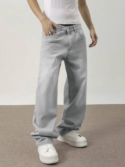 Chillumni 男士斜口袋阔腿牛仔裤简约时尚 - 灰色 - 查看 1