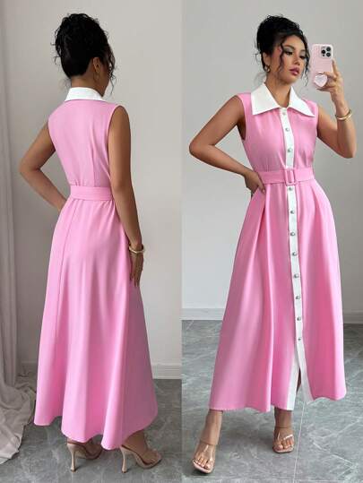 Chiquease 优雅简约腰带交叉领无袖前扣年轻女士粉色休闲连衣裙 - 粉色 - 查看 1