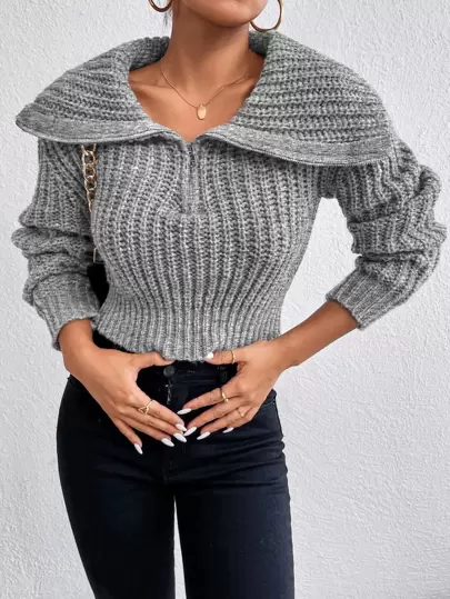 Chiquease 半拉链落肩毛衣,长袖针织套头衫,秋冬款 - 灰色 - 查看 1