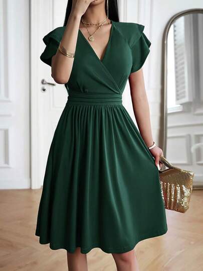 Chiquease 交疊領荷葉袖連衣裙 - 墨綠色 - 查看 1