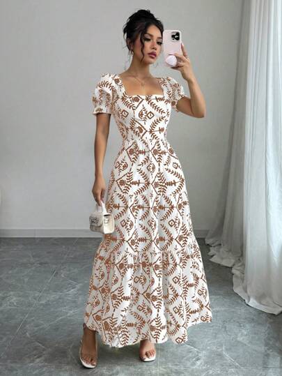 Chiquease 女士时尚优雅刺绣印花长裙 - 棕色 - 查看 1