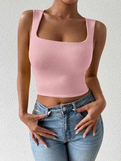 Chiquease 女士纯色短款修身 U 领吊带背心 - 粉色 - 查看 1