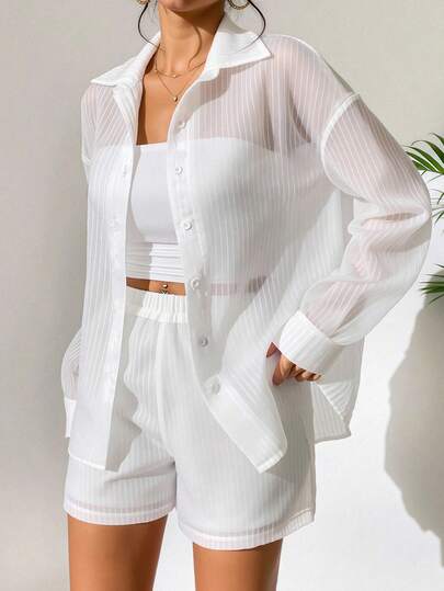 Chiquease 女士白色衬衫和短裤两件套,休闲海滩度假装,夏季 - 白色 - 查看 1