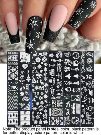 FULL BEAUTY 聖誕美甲壓花板5入組,包含雪花、聖誕樹、鈴鐺、花環、麋鹿,美甲模具壓花版,美甲印花模板,美甲工具 - 銀色 - 查看 10