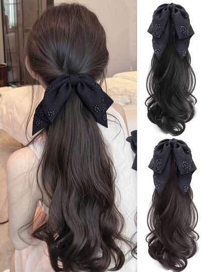 圣诞派对假发马尾,镶钻,波浪卷发马尾发夹,自然优雅发型假发爪(可拆卸蝴蝶结,二合一套装)冬季发饰爪夹 冬季发爪 - 彩色 - 查看 1