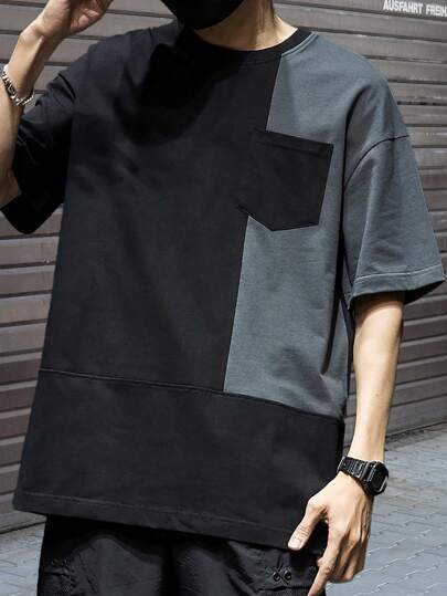 Claim Dot 宽松版型男式双色落肩口袋贴片 T 恤 - 黑色 - 查看 1