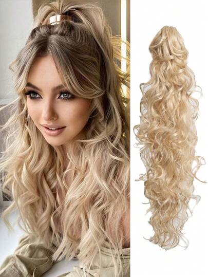 30英寸淺色金色卷曲爪夾馬尾延長款,柔軟自然合成髮片,適用於女性