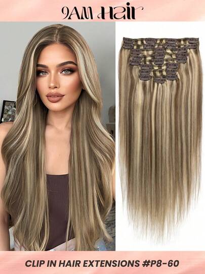 夹式接发真人发 9 件 120 克夹式接发 14-16 英寸 #P8/60 灰棕色混合铂金色直发夹式接发雷米真人发女士 - S8/60 - 查看 9