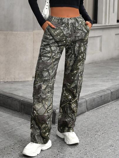 SHEIN EZwear 全印花休闲直筒牛仔裤,带口袋 - 彩色 - 查看 6