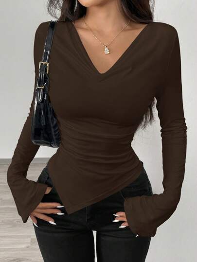 Airlisse 女士不对称下摆圆领针织T恤,肩带设计,收腰,适合冬季和新年穿着 - 棕色 - 查看 7