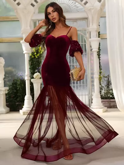 挖肩亮片泡泡袖網紗拼接喇叭下擺連衣裙