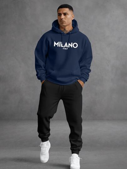 Unisex Printed Milano Italy Sweatshirt Set, Hoodie, Pants And Kangaroo Pocket Top - 藏蓝色 - 查看 1