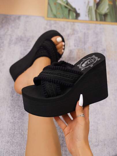 女士时尚黑色露趾休闲高跟凉鞋,带可爱绒球装饰,厚跟厚底坡跟设计,适合户外、度假、派对 - 黑色 - 查看 1