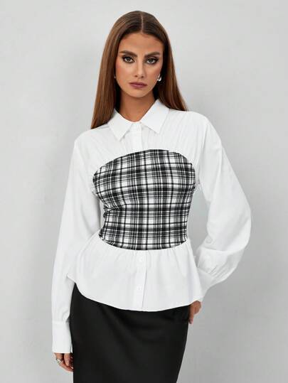 Chiquease 女式拼色格子长袖工作衬衫 - 彩色 - 查看 1