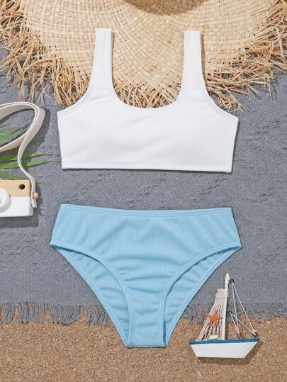 青少年女孩拼色罗纹比基尼套装夏季海滩 - 彩色 - 查看 1