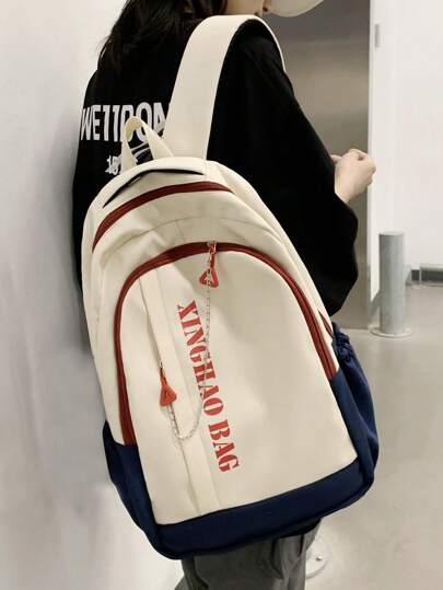 女性用拼色大容量鏈條字母背包,休閒青少年背包,適合高中生,大學女生使用,適用於上課與旅遊 - 彩色 - 查看 1
