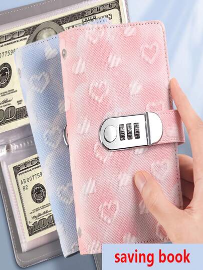 密码锁存钱罐,可爱心形图案,方便,适合女性,包含 50 页,可容纳超过 100 张支票、账单、照片、邮票和银行卡,方便存储和管理 - 灰色 - 查看 5