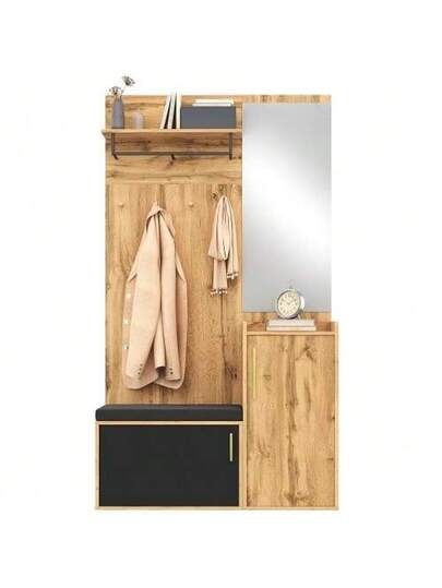 Compact Wardrobe With Mirror And Bench, Hallway Wardrobe With Shoe Cabinet And Hooks, Coat Hooks, Compact Wardrobe, Hallway Furniture Set, Hallway Wardrobe In Wood Look - 自然色 - 查看 1