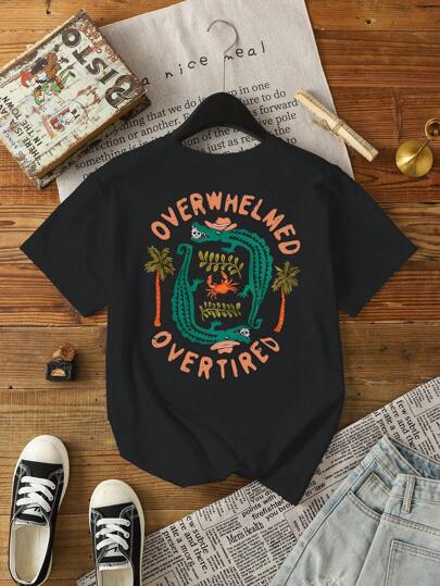INAWLY 困惑 T 恤,夏季西式图案 T 恤,带帽子、鳄鱼、棕榈树、螃蟹和字母印花,女士海滩休闲圆领短袖衬衫 - 黑色 - 查看 1