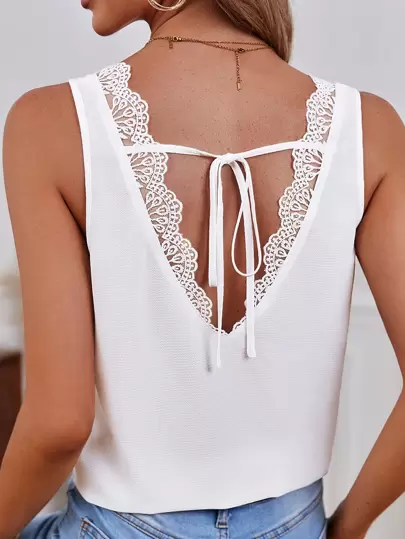 SHEIN Frenchy 拼接水溶蕾絲後綁帶襯衫 - 白色 - 查看 1