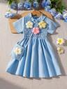 年轻女孩时尚可爱落肩花卉 3D 欧根纱串珠领连衣裙
