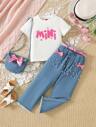 2 件套年轻女孩休闲荷叶边领泡泡袖连衣裙 + 配套简约手提包套装