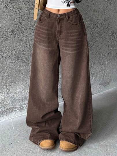 Coolane 少女休闲宽松水洗阔腿牛仔裤 - 棕色 - 查看 1