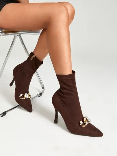 燈芯絨鏈條和水鑽裝飾細跟彈力靴 - 咖啡棕 - 查看 1