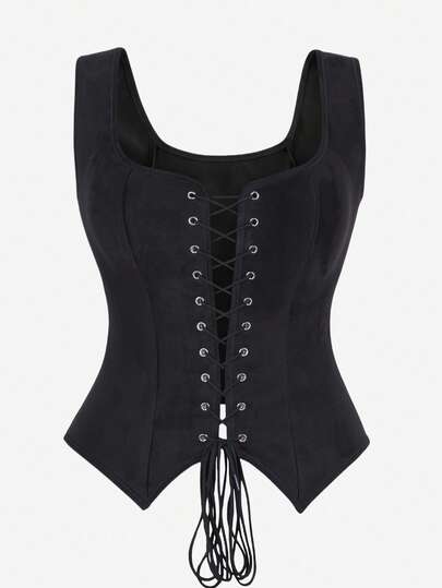 束身胸衣上衣背心前系带宽肩女士塑身衣短款上衣,可作为紧身衣、束身衣、朋克背心穿在外面,适合舞会、化妆舞会、角色扮演服装、万圣节、腰部训练器 - 黑色 - 查看 10