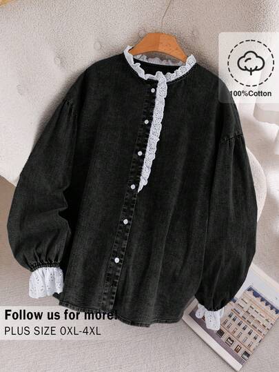 CosyJoli 大码女装秋冬衬衫、纽扣上衣、水洗牛仔衬衫、可爱蕾丝衬衫、休闲女装、女童服装、灯笼袖衬衫