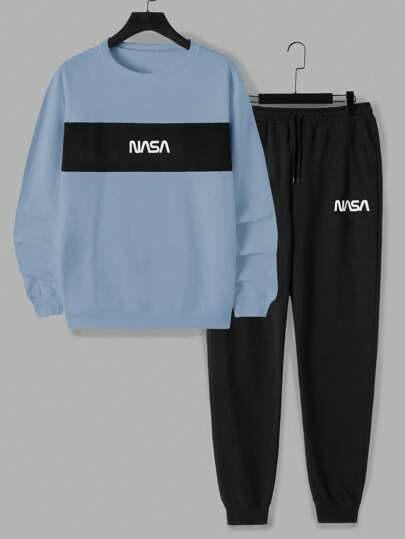 RueChic 男士字母印花运动衫配抽绳腰部慢跑裤 2 件/套 - 藍色 - 查看 1