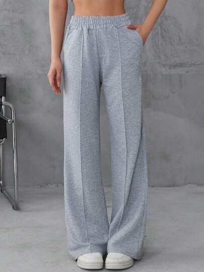 RueChic 100%纯棉纯色松紧腰阔腿运动裤 - 灰色 - 查看 1