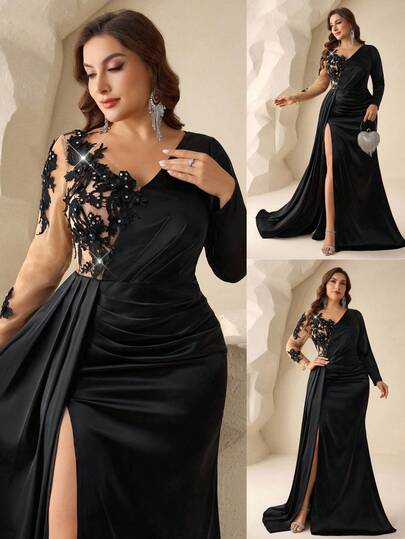 Coutiva 优雅的亮片缎面连衣裙,深V领,露背设计,长袖,鱼尾裙摆;非常适合正式晚宴穿着,适合婚礼宾客或婆婆穿着。 - 黑色 - 查看 1