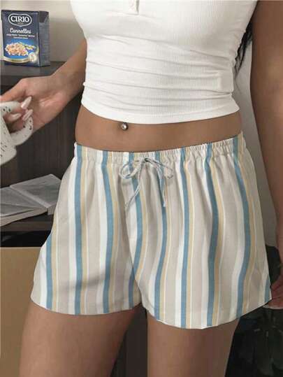 SHEIN EZwear 女士條紋沙灘假期短褲,春夏完美穿搭 - 白色 - 查看 4