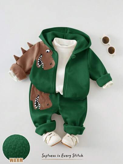 Cozy Pixies 2件套男童卡通恐龙印花连帽夹克和松紧腰裤套装 - 墨綠色 - 查看 1