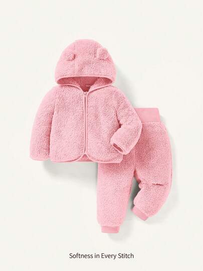 Cozy Pixies 2件套女婴连帽羊毛外套和厚裤子套装 - 粉色 - 查看 2