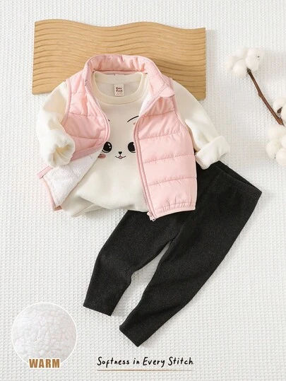 Cozy Pixies 3 件套女婴卡通猫咪图案针织柔软圆领长袖运动衫、羊毛背心和松紧腰打底裤套装 - 粉色 - 查看 3
