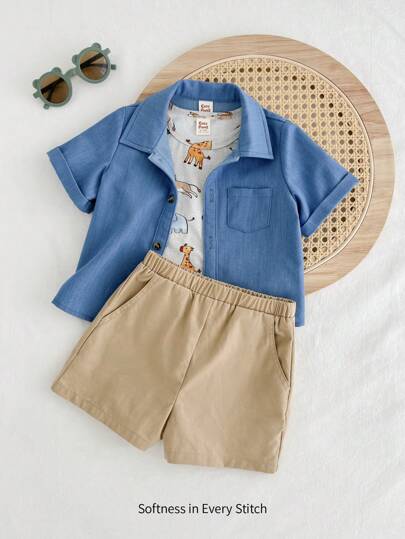 Cozy Pixies 3 件套男婴卡通动物图案针织柔软圆领套头衫、马球领开衫和休闲短裤套装 - 淺藍色 - 查看 3