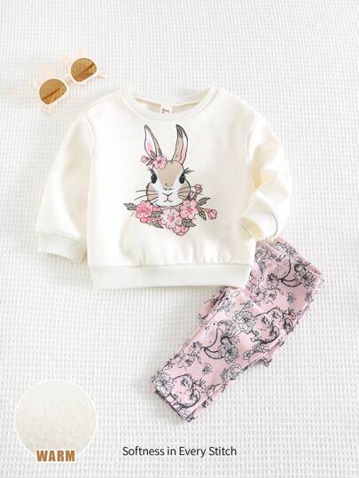 Cozy Pixies 女婴卡通兔子图案针织柔软圆领长袖套头衫和打底裤两件套 - 粉色 - 查看 1