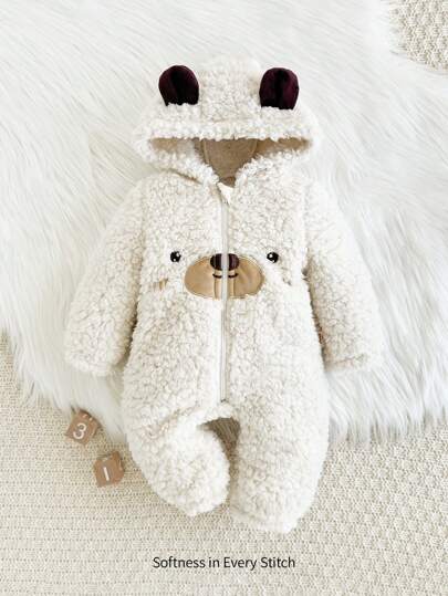 Cozy Pixies 新生男宝宝熊图案连帽加厚长袖连体衣 - 米色 - 查看 7