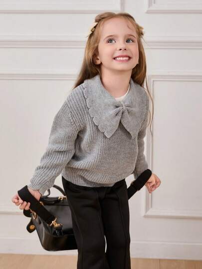 Cozy Pixies 适合年轻女孩的柔软针织蝴蝶领长袖套头衫 - 灰色 - 查看 1