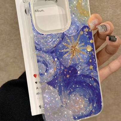 创意蓝紫色星空图案手机壳,兼容 11 12 13 14 15 16 17 Pro Max 7 8 Plus X XS Max XR 16e,金色星形图案防震保护套