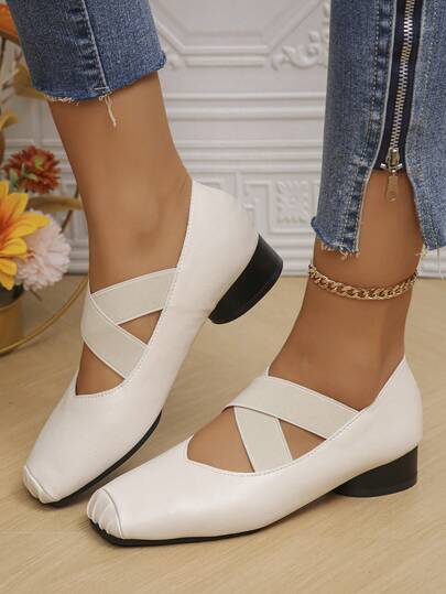 交叉帶芭蕾扁平鞋,純色彈性扁平鞋,圓頭打褶休閒軟底扁平鞋 - 白色 - 查看 6