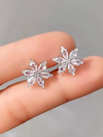 情人节方晶锆石花朵设计耳钉 - 銀色 - 查看 1
