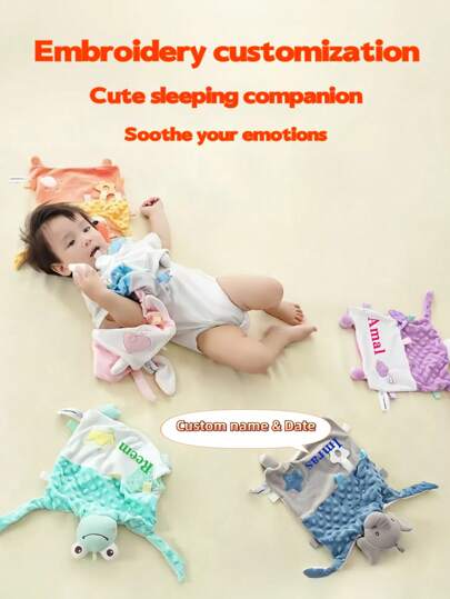 可定制名字刺绣个性化婴儿舒适毯、柔软毛绒婴儿奶嘴、口水围兜、咀嚼和摇铃出牙安全毯,适合睡眠 - 彩色 - 查看 12