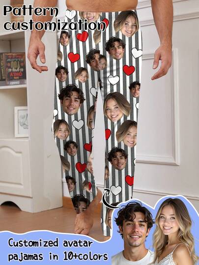 定制男士睡衣,带有独特的大照片/脸部印花,情侣脸部替换,节日氛围,秋季 - 彩色 - 查看 1