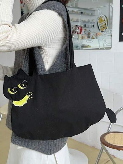 可爱卡通小猫印花手提帆布包,可爱女士单肩包,宽敞的学生手提包和购物袋 - 黑色 - 查看 1