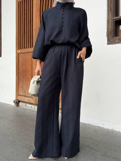 DAZY 2件套 女士高领泡泡袖休闲裤套装 - 藏蓝色 - 查看 1