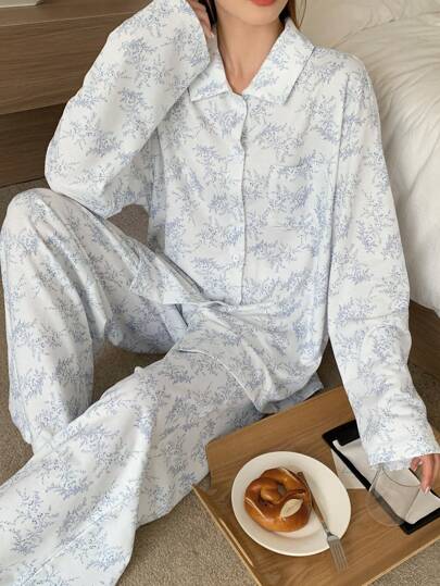 DAZY 花卉印花清爽睡衣套装,秋冬服装 - 白色 - 查看 1