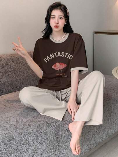 DAZY 字母图案撞色饰边落肩休闲套装睡衣 - 棕色 - 查看 1